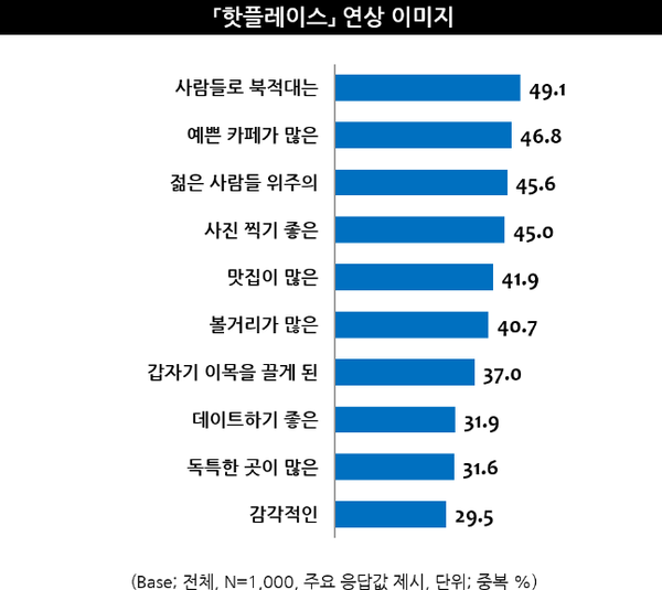 인기 지역 변동 폭 “너무 빠르다”…“모든 연령 공감 접근 필요”(머니파워=김유준 기자) 국민 10명 중 6명 이상이 옛스러움이 느껴지는 지역이 핫플레이스로 부상하는 것으로 조사됐다. 최근 젊은층을 중심으로 복고풍이 인기를 끄는 것과 상통하는 모양새다. 여기에 10명 중 7명 이상은 핫플레이스로 뜨고 지는 인기가 너무 빨라진다고 보고 있어 같은 흐름으로 보인다.29일 시장조사전문기업 엠브레인 트렌드모니터가 수도권에 거주하는 만 13~59세 남녀 1000명을 대상으로 ‘2024 핫플레이스 방문 경험 및 인식 조사’를 실시한 결과, 이같이 조사됐다.조사에 따르면, ‘젊은 사람들 취향에 맞춰 지역의 특색이 변화하는 듯한 느낌’이라고 답한 비율이 68.9%이고, ‘연령대가 있는 사람들이 가기에는 어려움이 많을 ..