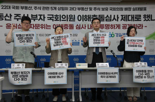 74명 주식 보유액 증가 1위는 최수진…경실련 “거래내역 신고 입법”(머니파워=머니파워) 국회의원을 대상으로 하는 재산 신고·공개제도와 ‘주식 매각 및 백지신탁제도’의 효과가 미비하다는 지적이다. 22대 국회 시작 직전인 2024년 3월 증권 보유자 149명의 신고액이 2575억 5000만 원이었으나 1년이 지난 올해 3월 기준 166명의 신고액이 2008억 7000만 원으로 1인당 12억 1000만 원인 것으로 조사된 결과다. 게다가 74명은 당선 이후 오히려 보유 신고액 증가했다. 상당수는 증권 보유분 정리보다는 반복적 매매 과정에서 신고된 것으로 실효적 처분으로 보기 어렵다는 지적이다.경제정의실천시민연합(경실련)은 9일 경실련 강당에서 기자회견을 열고 지난해 3월과 올해 3월 공개된 국회의원 재산 ..