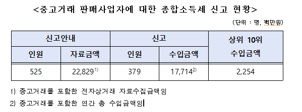 379명 신고액만 177억원…박성훈 “과세 사각지대 해소 만전 기해야”(머니파워=이원환 기자) 중고거래 중심으로 성장한 개인간거래(C2C) 플랫폼 종류가 다양해지고 있는 가운데, 올해 처음 종합소득세 신고 안내를 받은 당근마켓 등 중고 거래 플랫폼 이용자들이 평균 5000만 원에 육박하는 매출을 신고한 것으로 나타났다.국세청이 중고거래 거래 내역을 토대로 이용자들에게 종합소득세 신고 안내문을 보낸 것은 이번이 처음이다.국회 기획재정위원회 소속 박성훈 국민의힘 의원(부산 북구을)이 국세청에서 제출받은 ‘중고거래 판매사업자 종합소득세 신고 현황’에 따르면, 올해 신고 안내를 받은 이용자는 525명으로 금액은 총 228억 2900만 원으로 나타났다. 1인당 평균 4348만 원에 이른다.이 가운데 실제 종합소득..