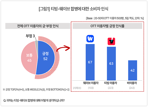 4명 중 1명 신규 가입 고려…요금 인상시는 대규모 이탈 예상(머니파워=강민욱 기자) 티빙과 웨이브가 합병을 추진하고 있는 가운데, 합병이 이뤄지면 OTT(Over The Top) 이용자 4명 중 1명이 합병 후 신규 가입을 고려하고 있는 것으로 나타났다. 그러나 합병 후 요금 인상시에는 대부분 마음이 돌아서고, 나아가 기존 구독자의 대규모 이탈까지 예상되는 결과가 나왔다. 다시말해 합병 후 이용자 확보에는 긍정적 효과를 기대하면서도 합병 후 성패는 요금 정책이 판가름할 것이라는 전망이다.11일 시장조사기관 컨슈머인사이트가 지난달 30일~12월1일 OTT 이용자 500명(전국 20~59세)을 대상으로 기획조사를 실시한 결과, 이같이 드러났다.조사에 따르면, 티빙·웨이브를 구독하지 않는 OTT 이용자 24..
